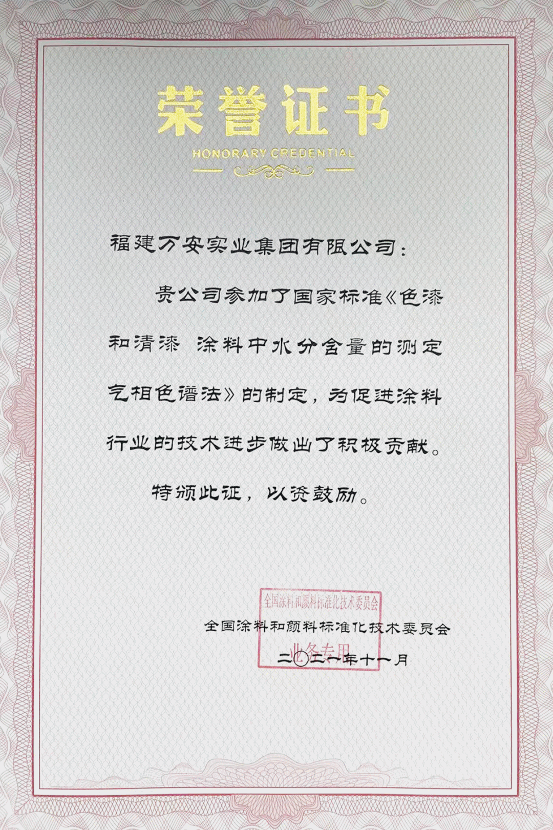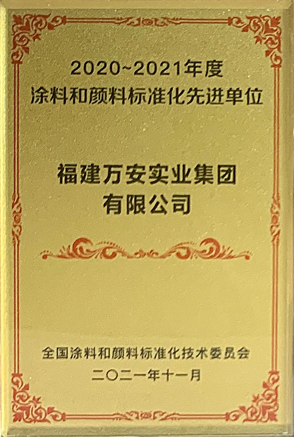 福建萬安集團堅持標準先行,推動行業(yè)良性發(fā)展,為促進涂料行業(yè)的技術(shù)進步做出了積極貢獻,受到行業(yè)的廣泛認可,也由此獲評“2020-2021年度涂料和顏料標準化先進單位”稱號。