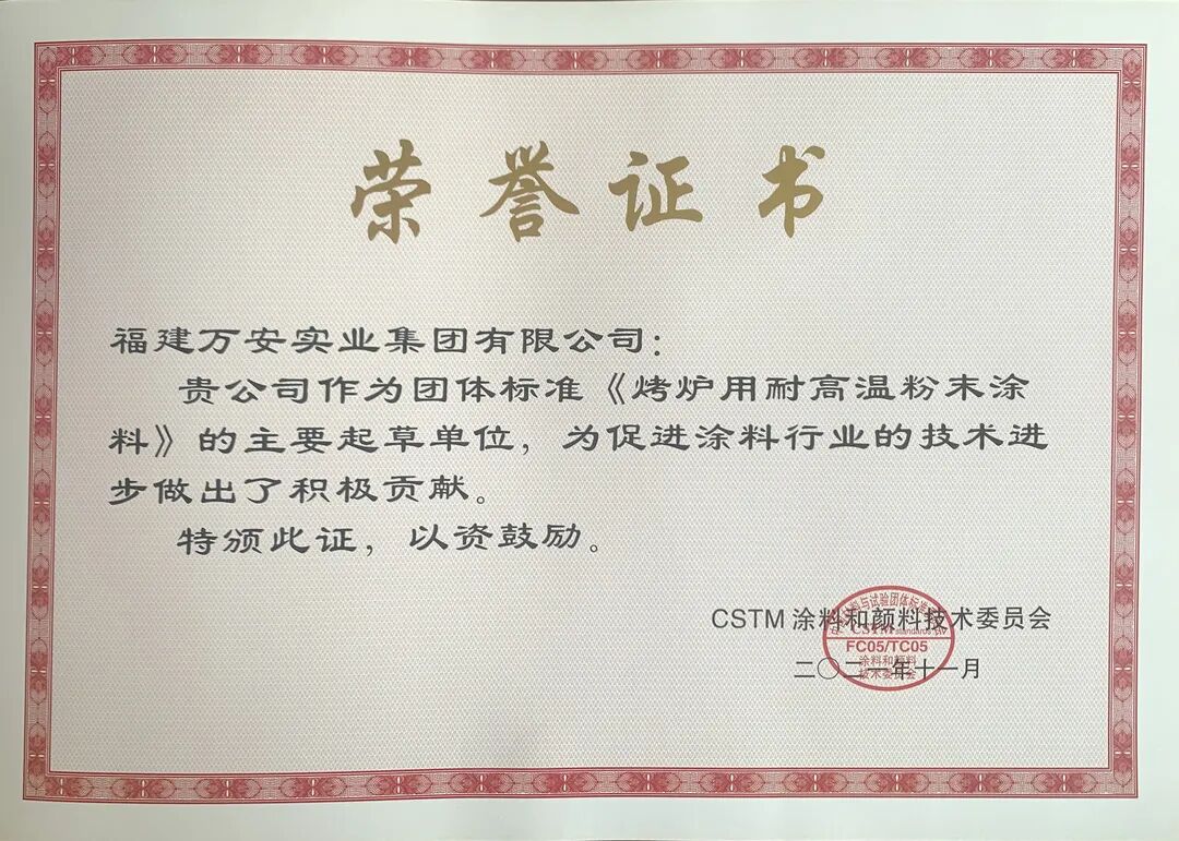 2020-2021年,集團主要參與制定了國家標準《色漆和清漆 涂料中水分含量的測定氣相色譜法》以及團體標準《金屬粉末涂料》,參加了GB/T 6739《色漆和清漆 鉛筆法測定漆膜硬度》、HG/T 3830《預(yù)涂卷材涂料》等國家標準修訂,同時主導起草了HG/T 2006《熱固性和熱塑性粉末涂料》、團體標準《烤爐用耐高溫粉末涂料》,完善行業(yè)標準體系、推動涂料行業(yè)的技術(shù)進步,萬安集團一直在行動。